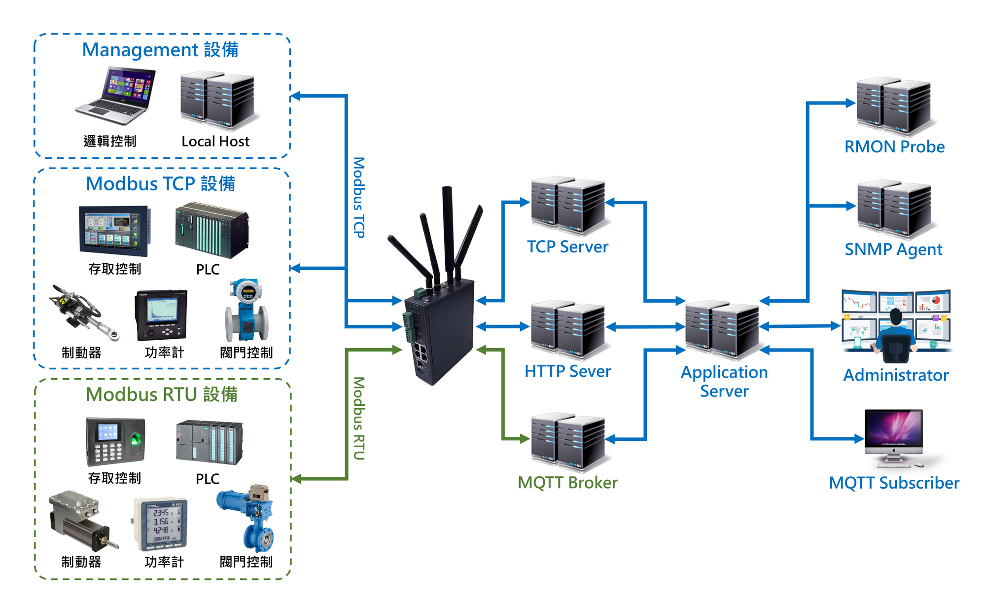 在工業現場,IAD200 可同時扮演 Modbus Gateway、MQTT Publisher,透過 RS-485 介面讀取 PLC、溫度控制器或能源表的 Modbus RTU 資料,IAD200 轉換成 JSON 格式後發佈至 MQTT Broker,並上傳至雲端平台。