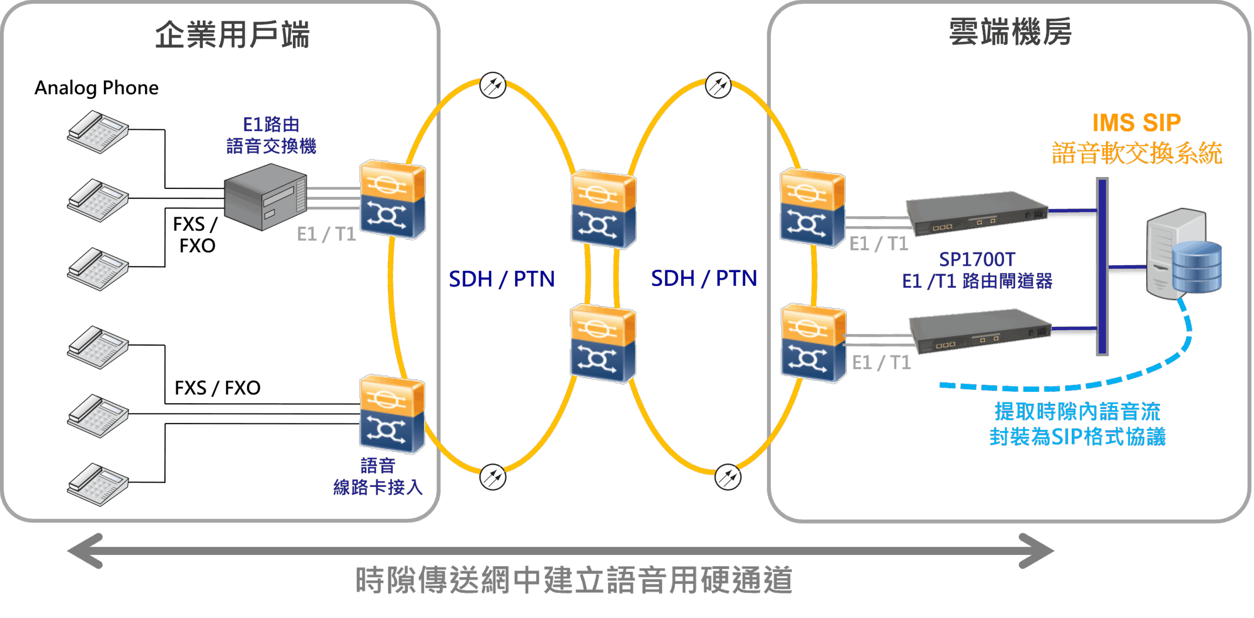 為了因應網路化、IP 化的趨勢,台聯電訊打造可運行在 SDH/ PTN 承載網環境的 E1/ T1 閘道器,提取語音流後封裝為 SIP 格式,並讓語音註冊至 IMS (IP Multimedia Subsystem) 語音軟交換系統,或企業 IPPBX 語音軟交換系統。