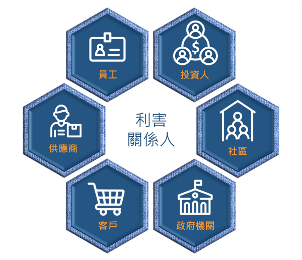 利害關係人鑑別與溝通,不僅是企業社會責任的核心基礎,更是邁向永續發展的重要參考依據,台聯電訊集團依照依據利害關係人議合原則 AA1000 Stakeholder Engagement Standard 進行主題鑑別,透過責任、影響力、親近度、依賴性、代表性、及政策意圖等六大原則,藉此掌握利害關係人關切的環境、經濟及社會等相關主題,鑑別出與公司相關之主要利害關係人,包括投資人、客戶、供應商、員工、政府機構、社區等六大族群。